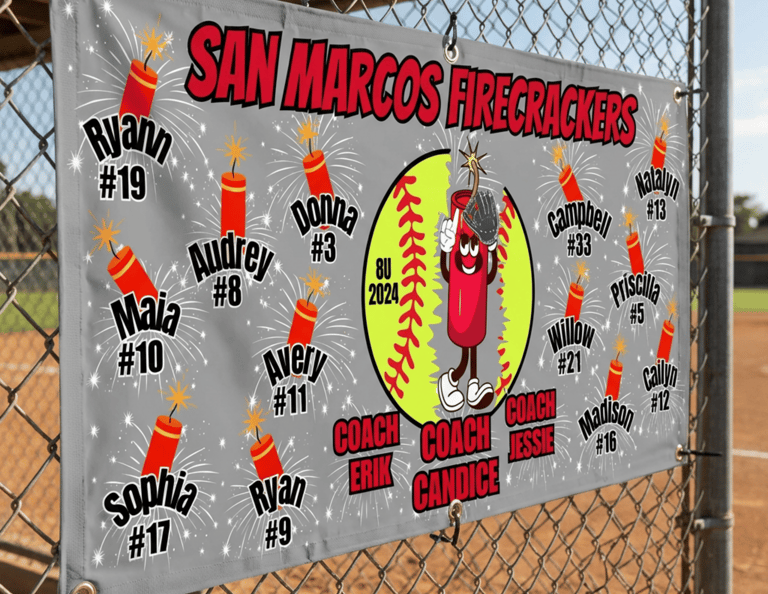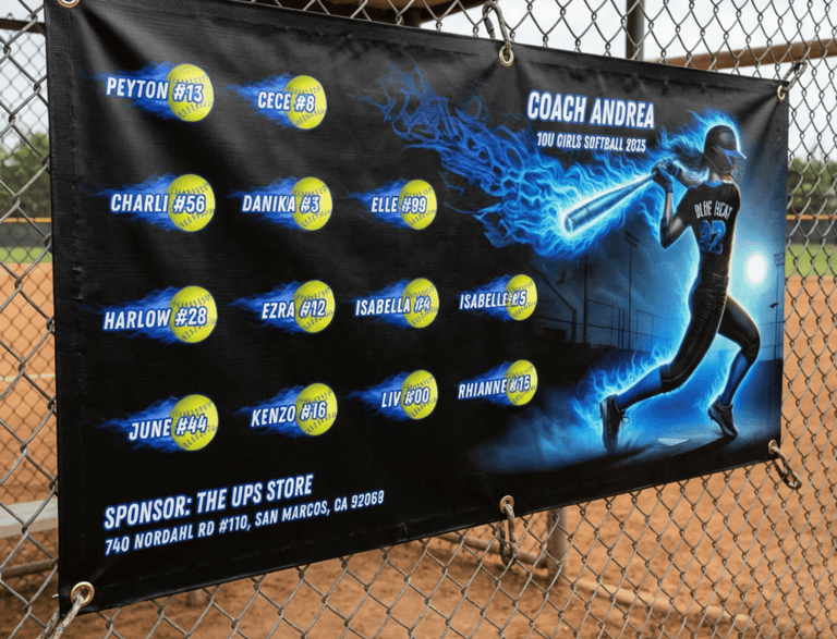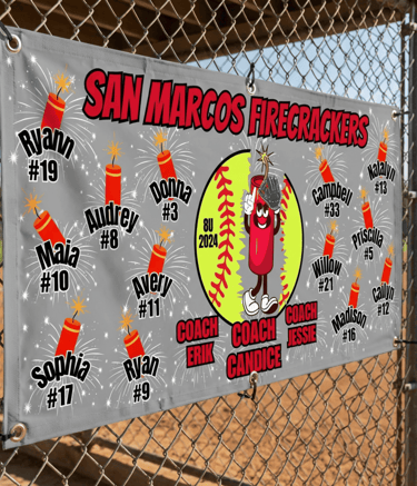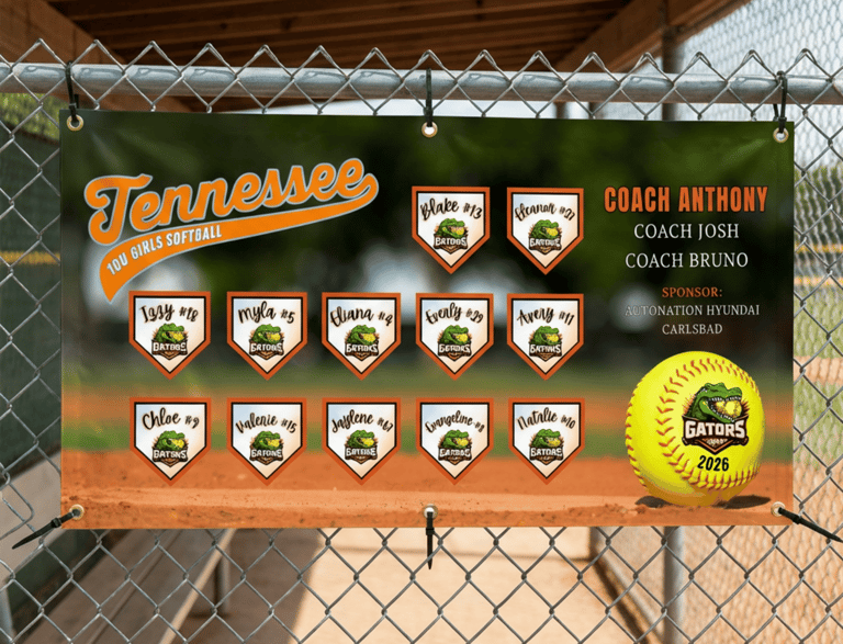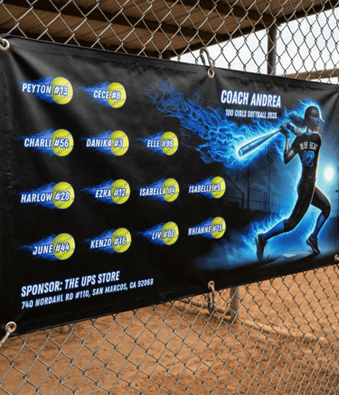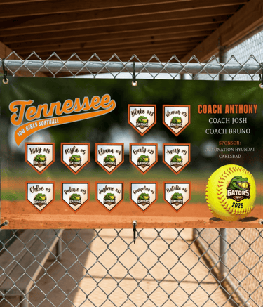 Make your team stand out with fully customized banners designed to celebrate your players, coaches, and season. Printed on durable 72” x 36” heavy-duty vinyl with reinforced grommets. Perfect for fences, dugouts, and game day display.